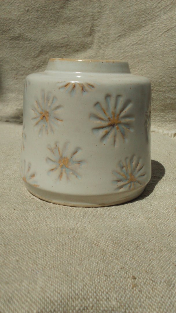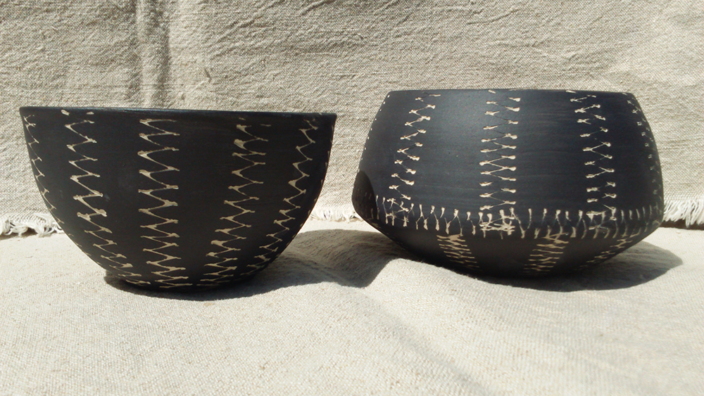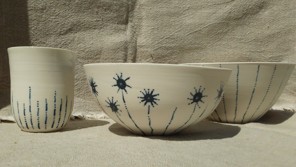 J'utilise des engobes sgraffités, des émaux que je créer et des jus d'oxydes travaillés à la plume.