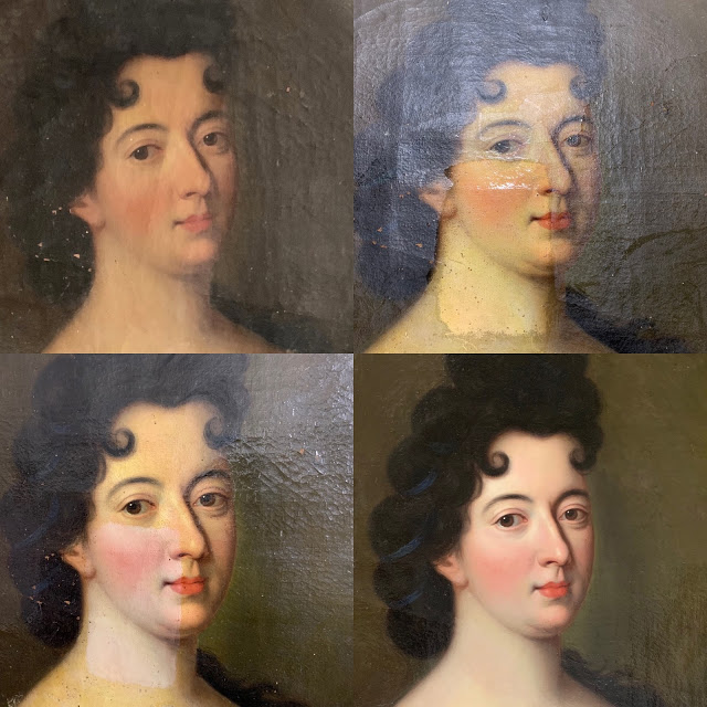 Exemples d'interventions courantes : traitement biocide, traitement de déchirures, traitement de perte d'adhérence, doublage, bandes de tension, retrait de matériaux inadaptés, nettoyage, traitement de lacunes, retouches illusionnistes, vernis.