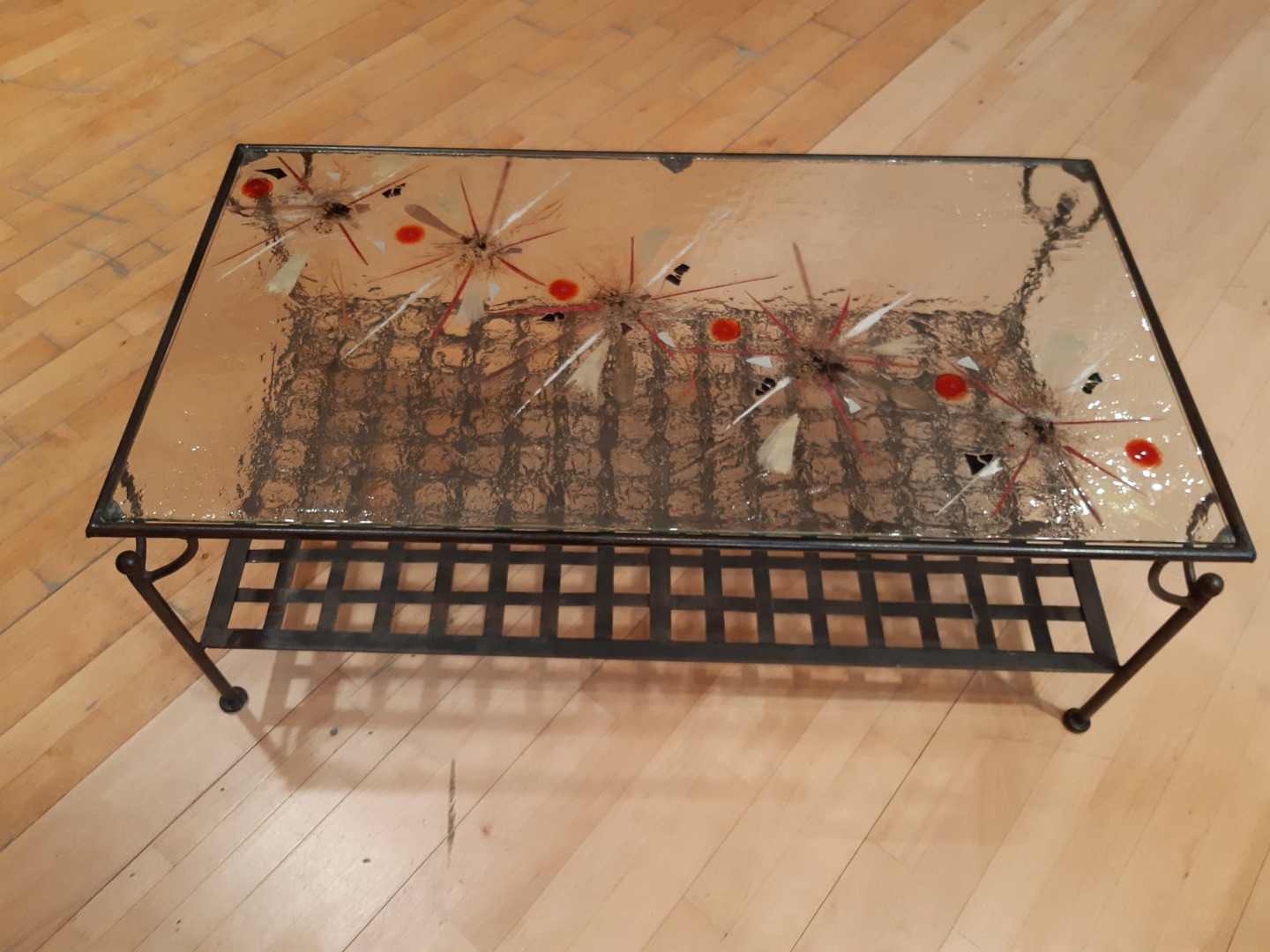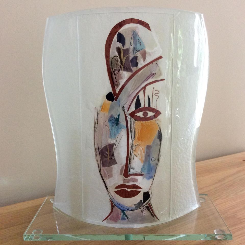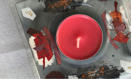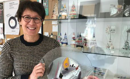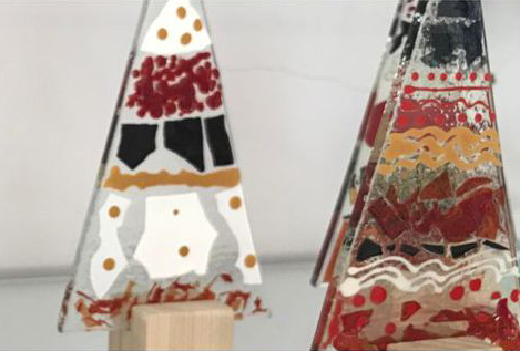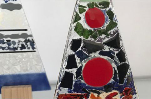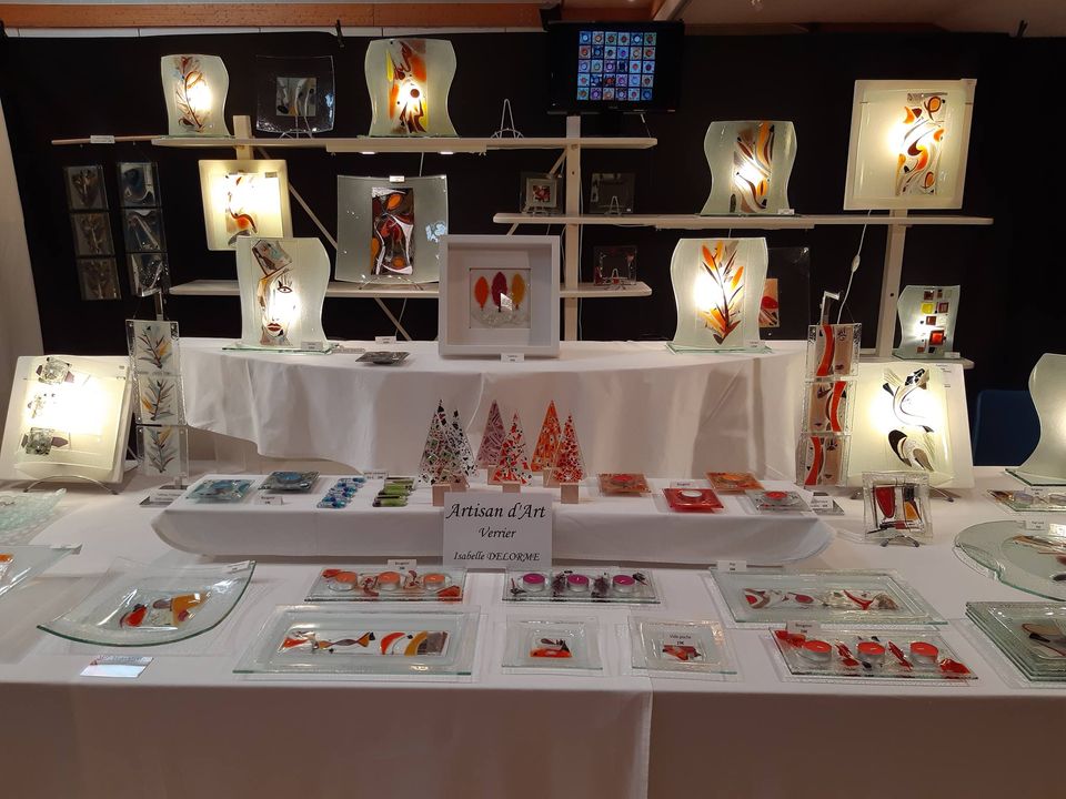 Isabelle Delorme travaille à partir de plaques de verre entre lesquelles elle intègre des pigments colorés, des feuilles de cuivre, des poudres métalliques or et argent, de la fibre de verre, du fil d’acier qui seront fusionnées est déformées sous l’effet de la chaleur lors de la cuisson au four à 820° en fonction de la forme des boules de sa création.